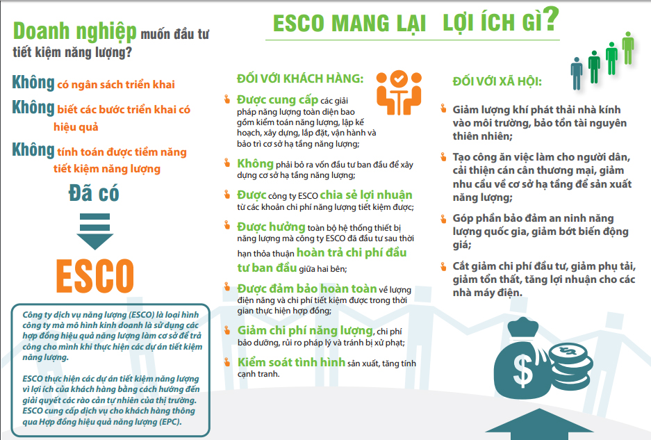 ESCO (Energy Service Company) Đây là một loại hình doanh nghiệp cung cấp các giải pháp năng lượng toàn diện cho khách hàng, tập trung vào việc tiết kiệm năng lượng và nâng cao hiệu quả sử dụng năng lượng. cung cấp các sản phẩm , giải pháp năng lượng từ các khâu tư vấn thiết kế thi công lắp đặt vận hành , tài chính, quản lý các rủ ro, sự cố trong lĩnh vực năng lượng cho khách hàng Và thu tiền dựa trên hiệu quả tiết kiệm năng lượng do hệ thống này mang lại.